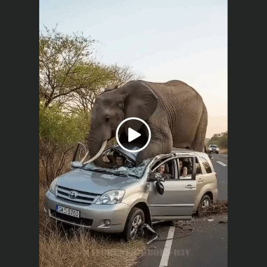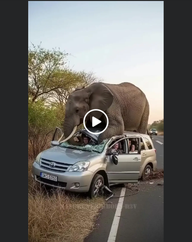 In a heartbeat, the giant closed the distance. The driver barely had time to slow before the elephant placed his trunk on the hood, testing its strength. Then, with terrifying power, he climbed onto the vehicle. Metal crumpled like paper under his weight, the windshield shattering into a spiderweb of cracks.