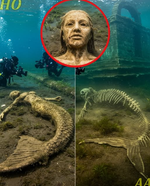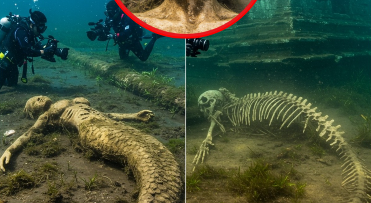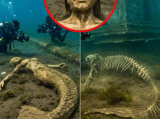 The divers’ cameras captured what seemed impossible. The body, preserved by the cold, mineral-rich depths, had a human-like torso and arms, but below the waist, scales shimmered and a powerful tail curled, ending in a split fin. Leathery skin, intact after centuries, glowed eerily in the torchlight. Strands of dark hair fanned out around a skull-like face, its hollow eye sockets staring into the abyss.